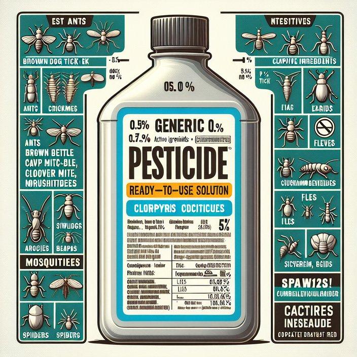 The pesticide product "Household Spray Ready-To-Use" is designed for consumer use to control various household pests. It comes in a ready-to-use (RTU) form, making it convenient for application without the need for mixing or dilution. The active ingredient in this product is Chlorpyrifos, constituting 0.5% of the total formulation. **Usage:** "Household Spray Ready-To-Use" is typically used by spraying directly onto areas where pests are found or are likely to congregate. Usage instructions generally include: - Shaking the container well before use. - Spraying in infested areas such as baseboards, under sinks, behind appliances, and around entry points. - Avoiding spraying directly on people, pets, and food surfaces. - Ventilating areas after application. **Toxicity to Cats and Dogs:** Chlorpyrifos is an organophosphate insecticide and can be highly toxic to both cats and dogs. Exposure can occur through ingestion, inhalation, or skin contact. - **Symptoms of Toxicity:** Symptoms of chlorpyrifos poisoning in pets may include drooling, vomiting, diarrhea, difficulty breathing, muscle tremors, seizures, and potentially death in severe cases. - **Cats:** Cats are particularly sensitive to Chlorpyrifos. Even small amounts can cause significant toxicity, and they may exhibit signs of poisoning more rapidly than dogs. - **Dogs:** Dogs can also experience severe health effects from Chlorpyrifos exposure, although they may be slightly more tolerant than cats. However, the symptoms and risks remain serious. **Precautions:** - Ensure pets are removed from the area during application and until the spray has completely dried and the area is ventilated. - Store the product safely out of reach of pets. - Follow all label instructions and safety guidelines provided by the manufacturer for safe application. Given the high toxicity of Chlorpyrifos to pets, it is crucial to handle this pesticide with care and consider alternative pest control methods that are safer for pets. If a pet is suspected of being exposed to Chlorpyrifos, immediate veterinary attention is necessary.